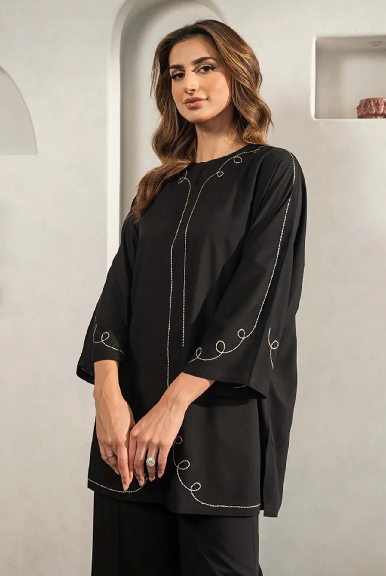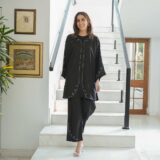 Make a subtle yet striking statement with the Luna Co-ord Set — a timeless black ensemble featuring soft swirl embroidery along the wide-sleeved top and matching wide-leg trousers. Designed for comfort and effortless sophistication, it’s the perfect choice for formal dinners, festive evenings, or chic daywear.