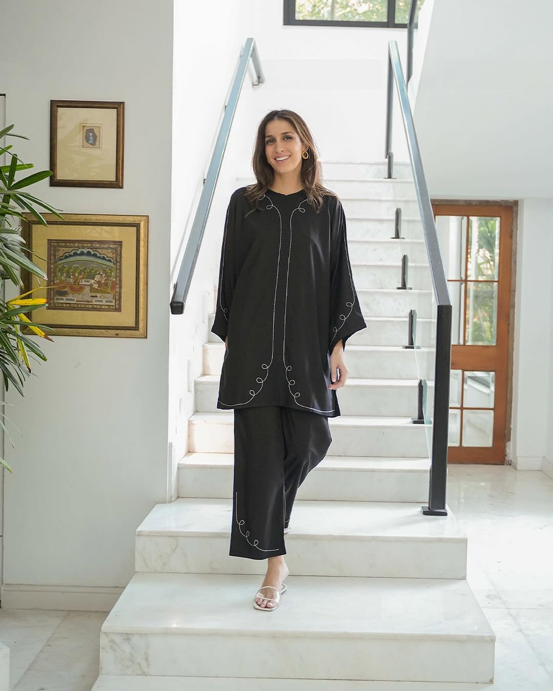 A classic black co-ord set with delicate thread embroidery, blending minimal elegance with modern charm.