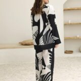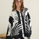 A premium black-and-white crepe co-ord set featuring bold abstract prints, a button-down top, and wide-leg trousers. Lightweight, flowy, and effortlessly stylish—perfect for chic everyday wear or elevated casual outings.