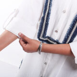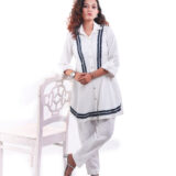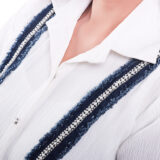 This white shirt co ord set is adorned silver buttons and denim lace with chain stone work paired with matching trousers